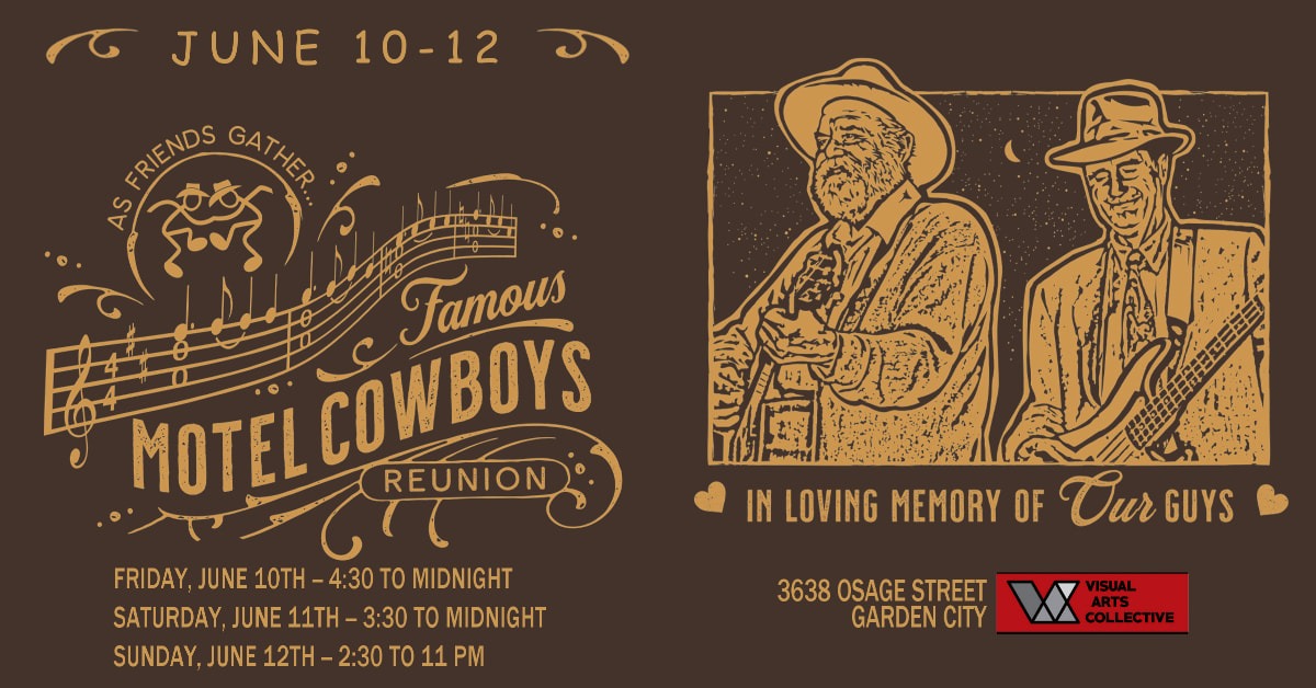 We’re excited to announce that the date and venue have been set for the 17th annual Famous Motel Cowboys Reunion! This year’s event will take place June 10th, 11th, and 12th at the Visual Arts Collective, 3638 Osage St, Garden City, ID 83714. The cover charge is $20 Friday and Saturday, and no cover on Sunday.